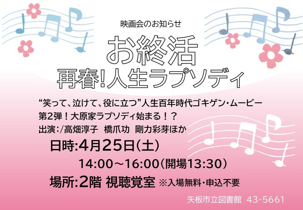 映画会のお知らせ「お終活 再春!人生ラプソディ」 投稿日: 2026年3月19日 映画会 懐かしい映画、もう一度見たかったアニメなどを上映します。今回は『お終活 再春!人生ラプソディ』です。 前の記事 次の記事