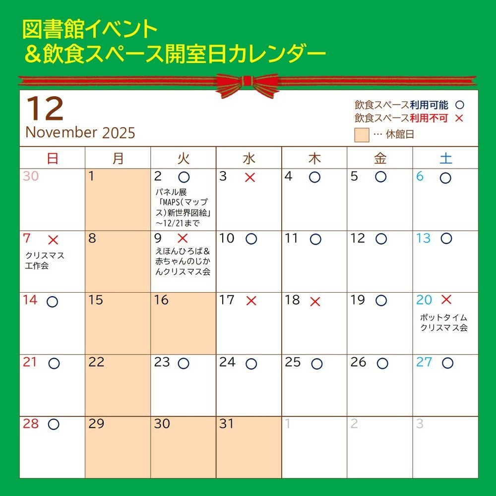 図書館イベント&飲食スペース開室日カレンダー(12月)